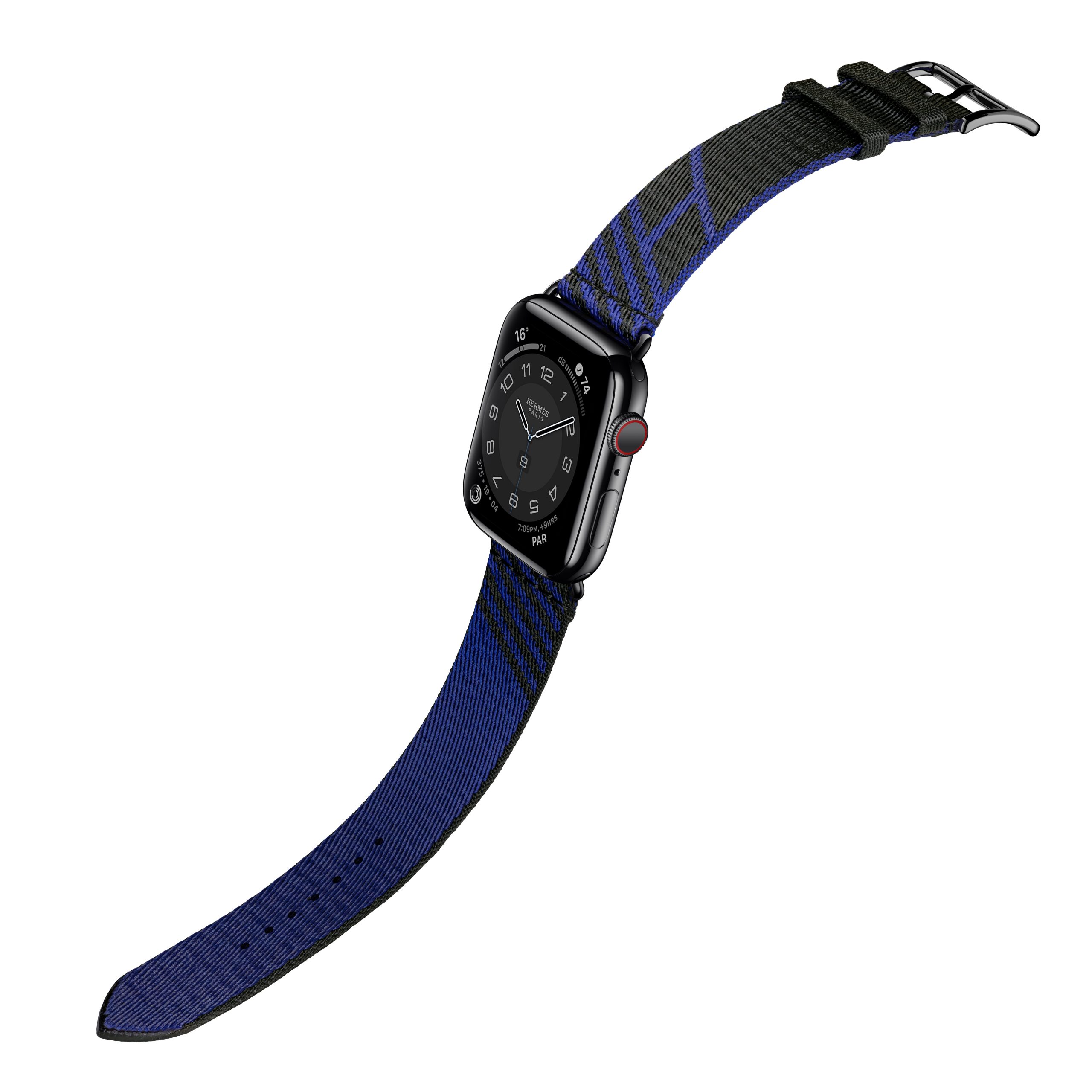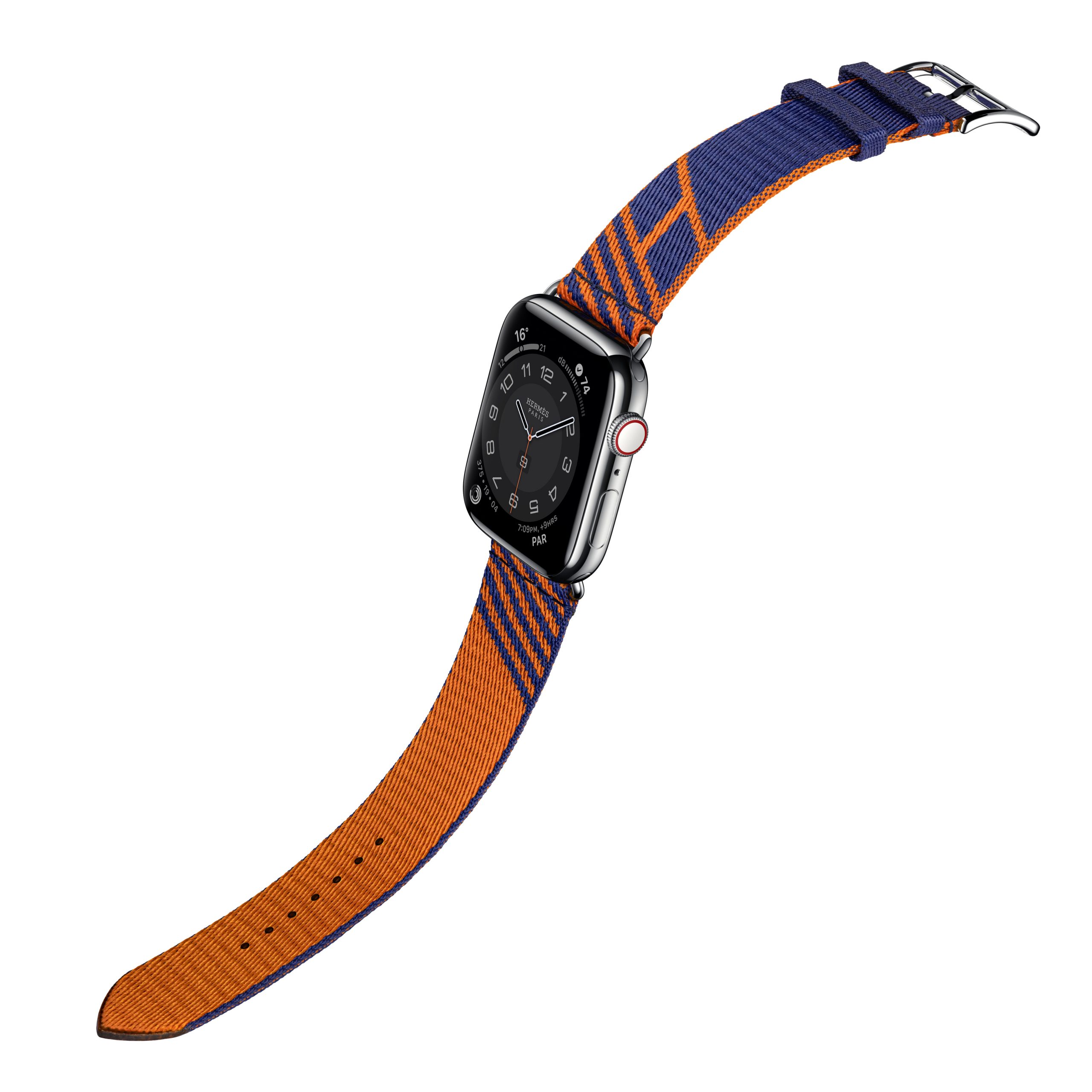 Named Jumping in reference to show jumping, the new single tour water-resistant band woven in the H Vibration design adorns in five colourways: Rouge de Coeur/Rouge H, Kraft/Rouge de Coeur, Orange/Rose Mexico, Bleu Saphir/Orange and Noir/Bleu Saphir. Combined with its saddlery-inspired buckle, the band can be paired with 40 and 44 mm case sizes of the Apple Watch.