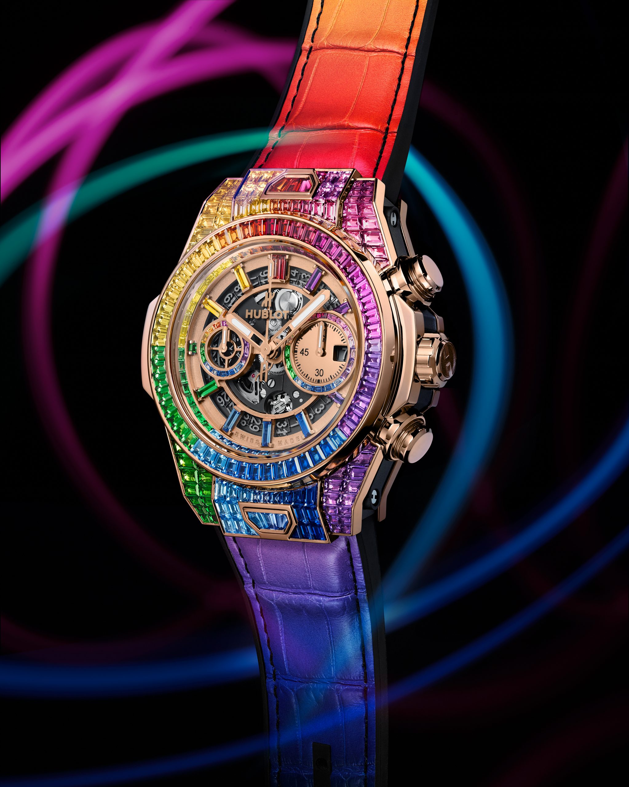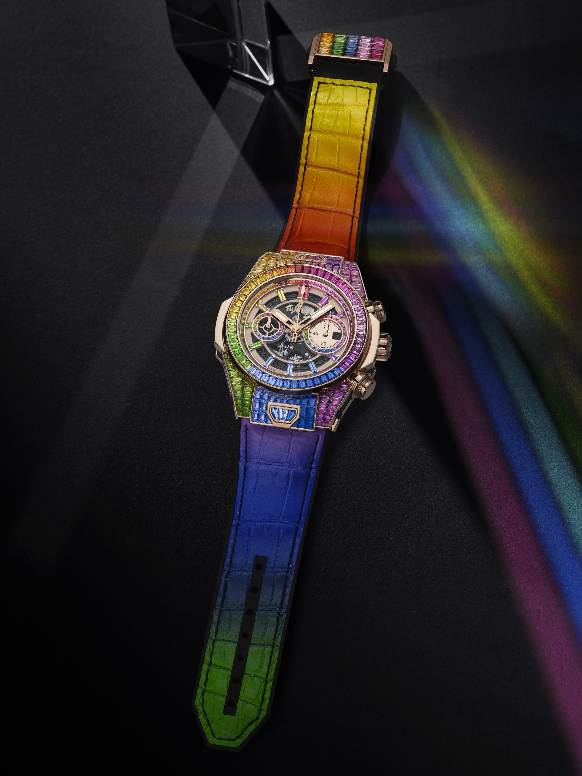 A symbol heralding optimism, wisdom and balance, the rainbow stretches across the entire 45-mm case; one hundred rubies, pink sapphires, amethysts, blue sapphires, blue topazes, tsavorites, and yellow and orange sapphires line up in a radiant chromatic composition. 112 baguette-cut gemstones edge its bezel in studied hues that echo the subtle shades of the 48 gemstones set on the dial and the indexes. The UNICO manufacture HUB1242 chronograph flyback mechanism with double clutch mechanism and column wheel appears in contrast. Putting the finishing touches to this jewellery piece, the celestial phenomenon unfolds across the alligator and natural rubber strap and illuminates the buckle clasp set with 30 other gemstones.