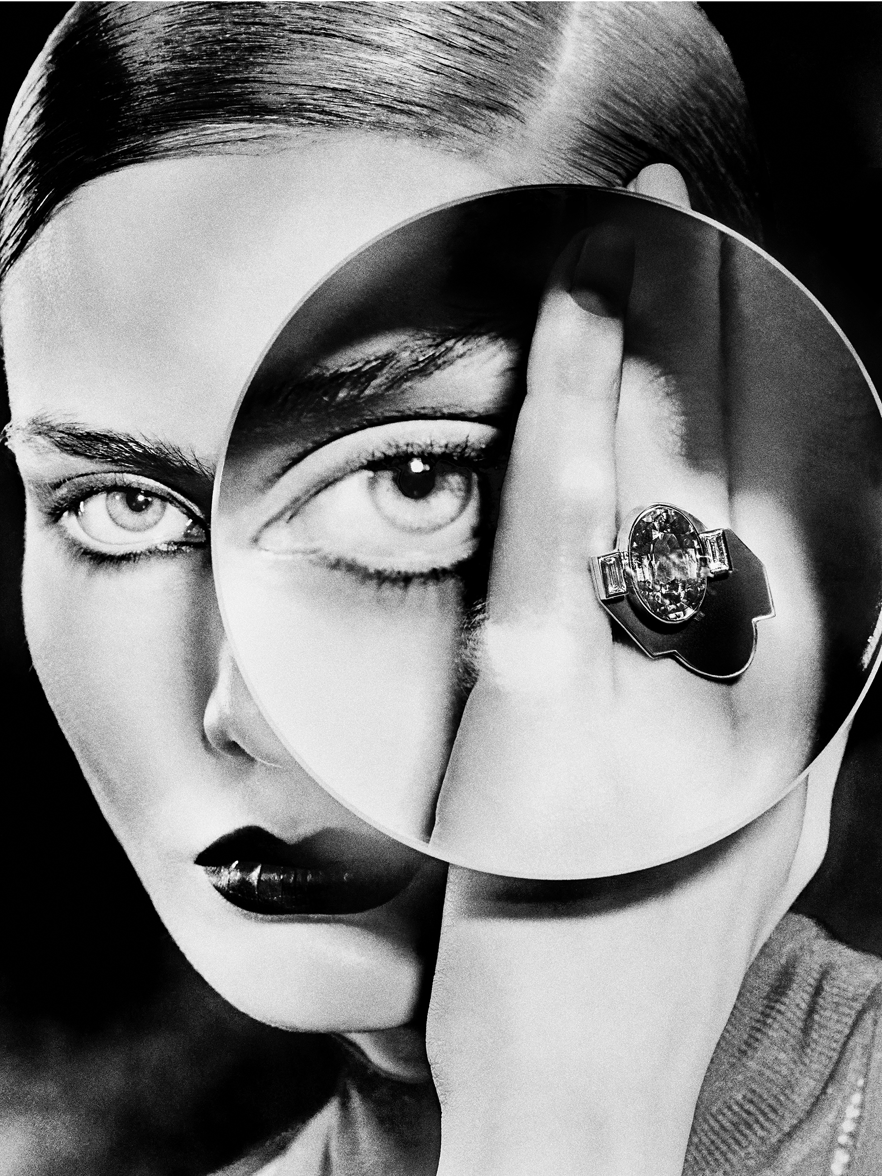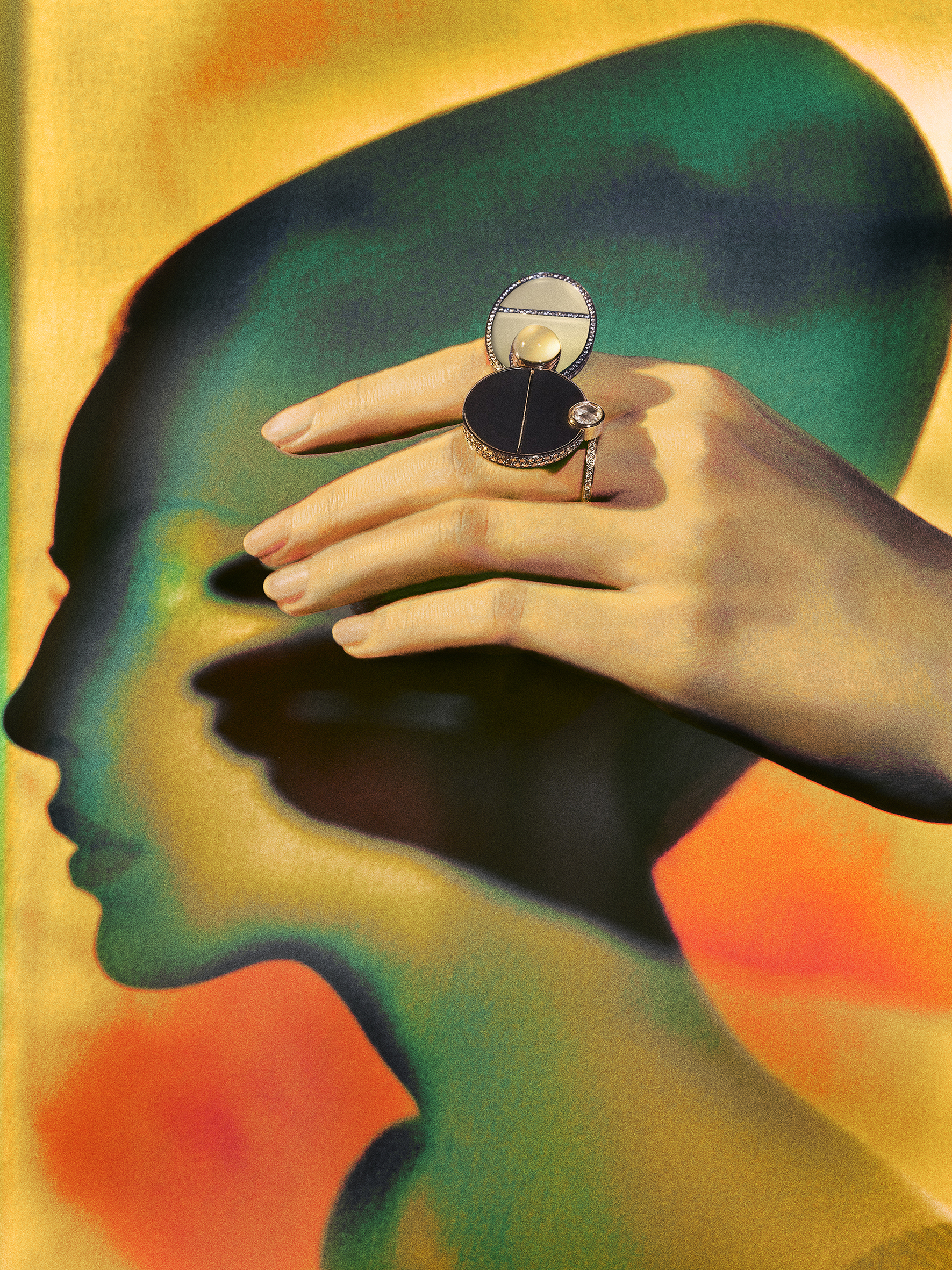 The collection features an array of pieces where shadows and light dance together in perfect harmony. Stones are enveloped in a black shadow, a soft form that overflows, accompanies, and protects them, thereby enhancing their brilliance. This effect is achieved using hand-polished jade with a satin finish or titanium set in rose gold, creating precious, shadowy jewels such as the rings, earrings, and the “Lueurs du jour” necklace.