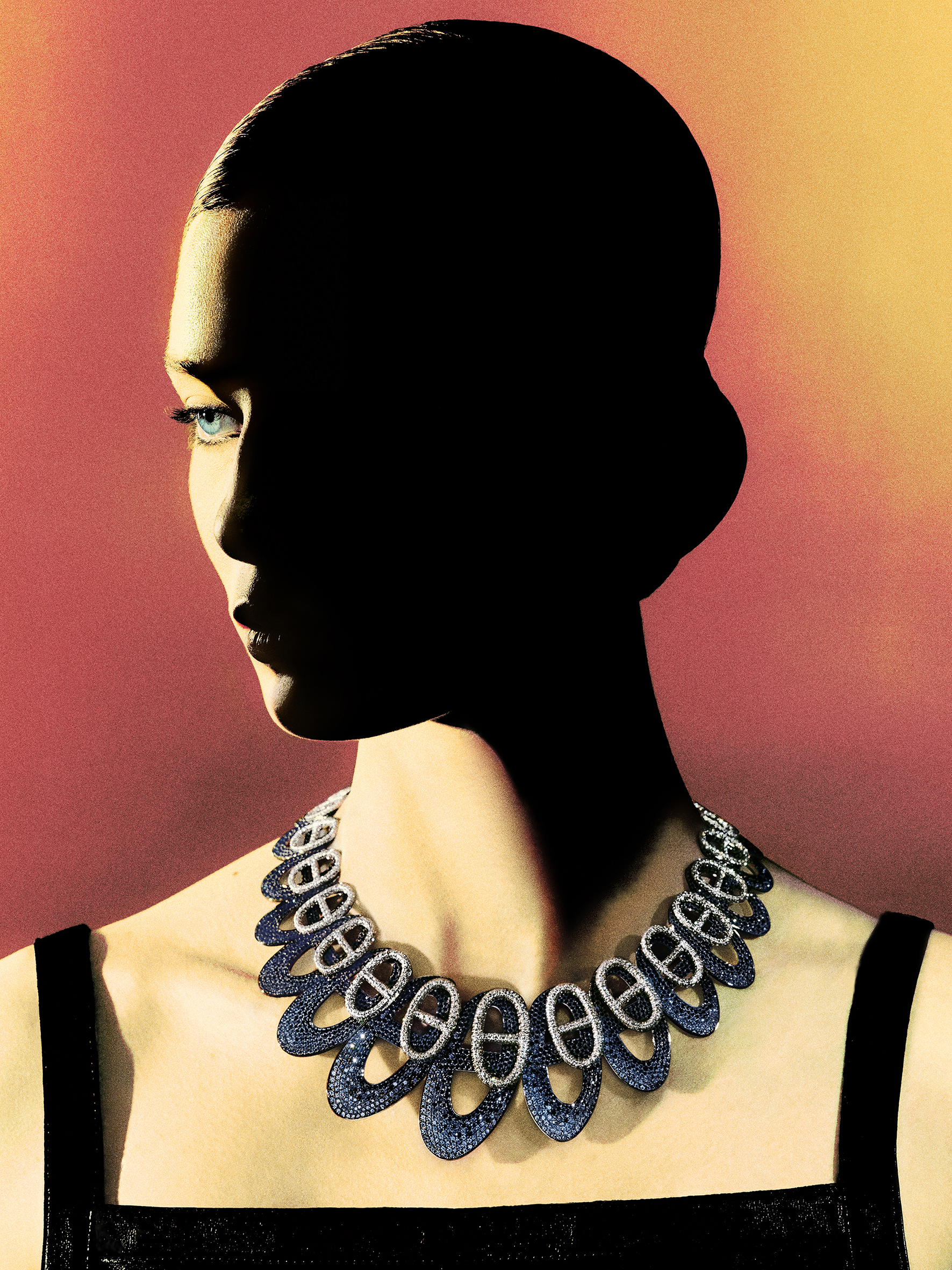 A unique approach to stone setting brings these designs to life while remaining faithful to their original sketches. The “Chaîne d’ombre” necklace, for instance, features a juxtaposition of flat white diamonds complemented by gradients of black spinels and blue sapphires, giving volume to the iconic anchor chain link. Each stone in this piece is meticulously placed, requiring seven hundred hours of setting and nearly two thousand hours of goldsmithing.